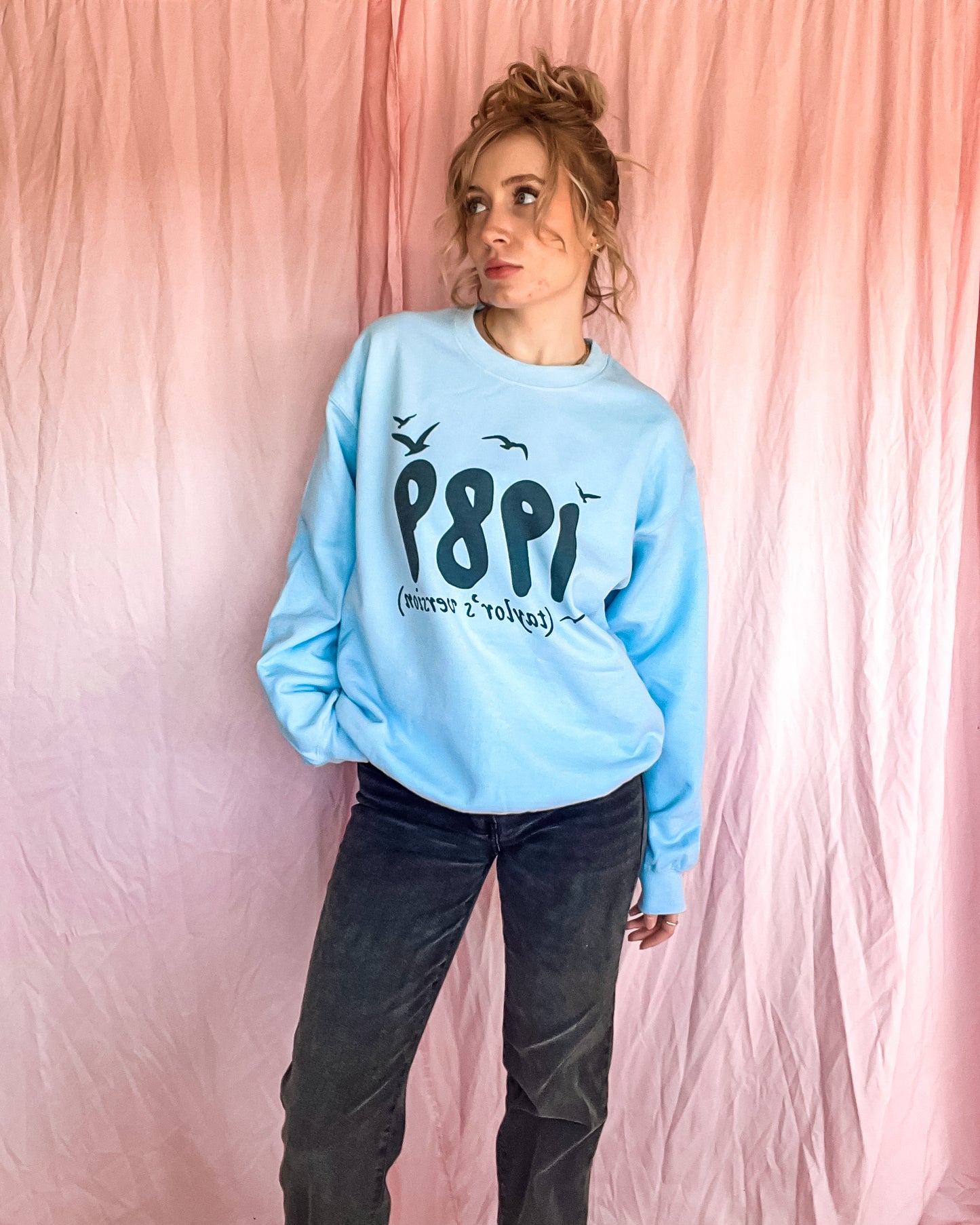 Sweatshirt features long sleeves, front graphic crew neckline, and brushes top of thighs in length.